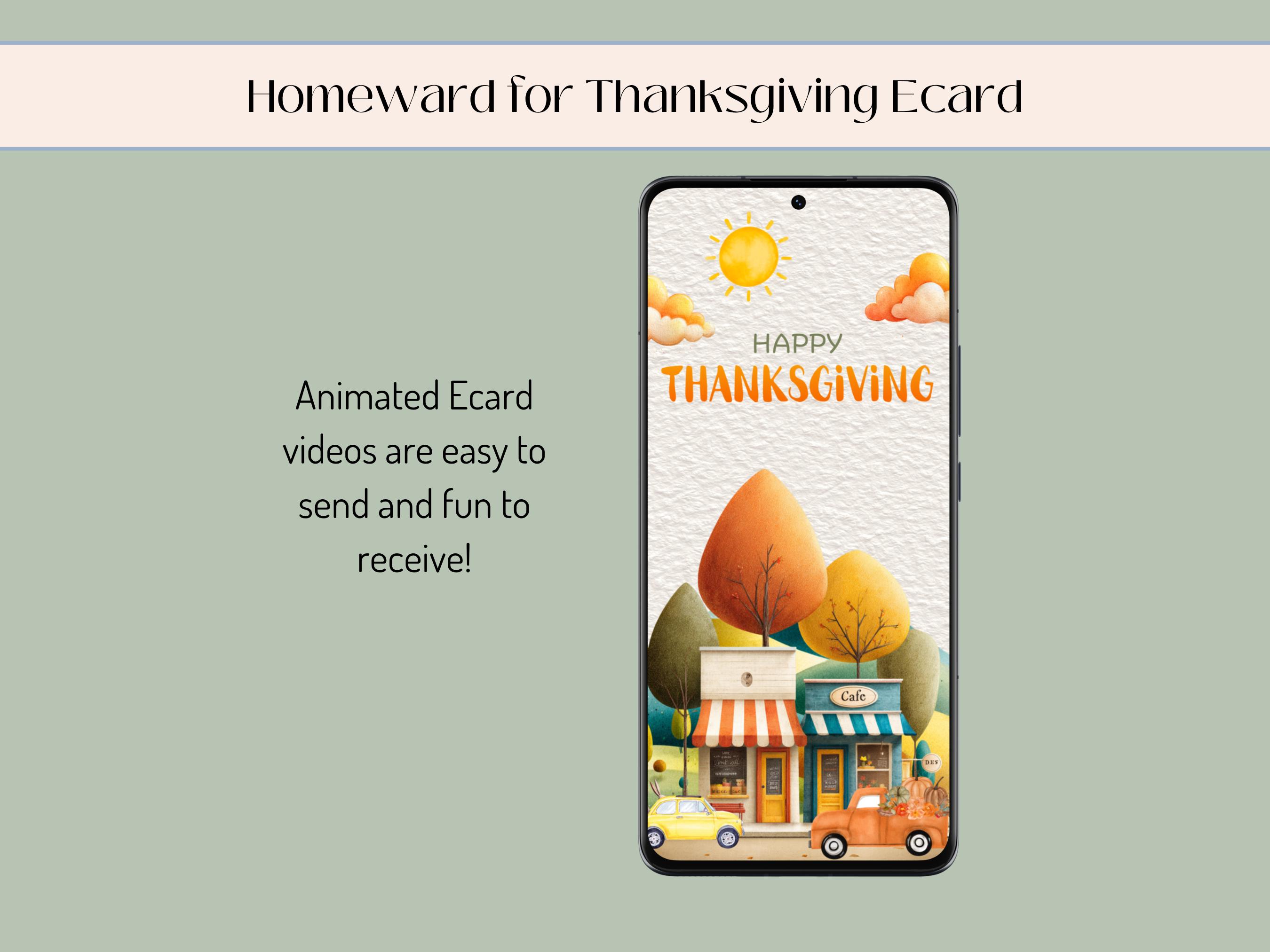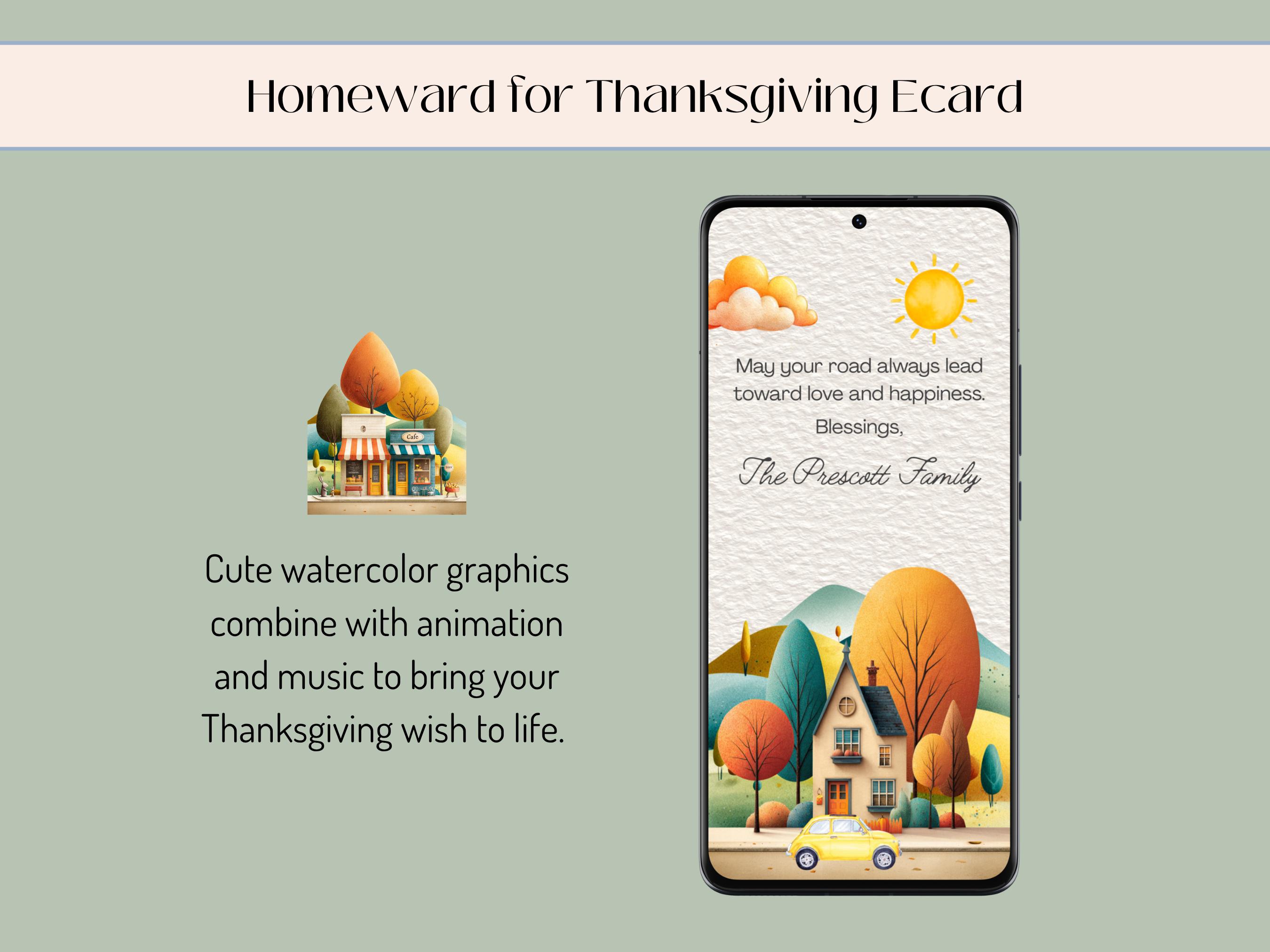 Share warm Thanksgiving wishes with this heartwarming animated musical video card! "Homeward for Thanksgiving" captures the nostalgic journey home for the holidays with charming autumn countryside scenes.
