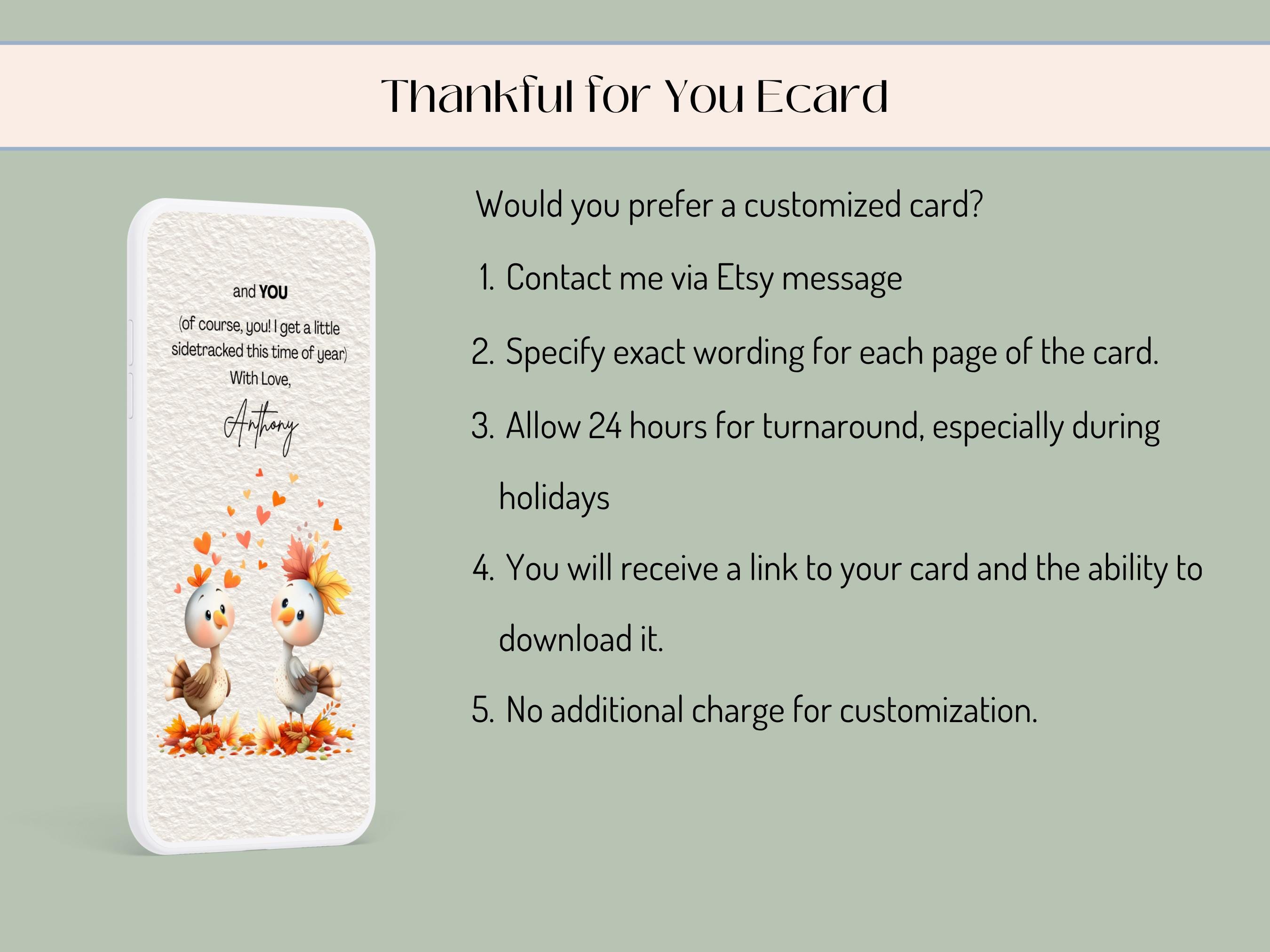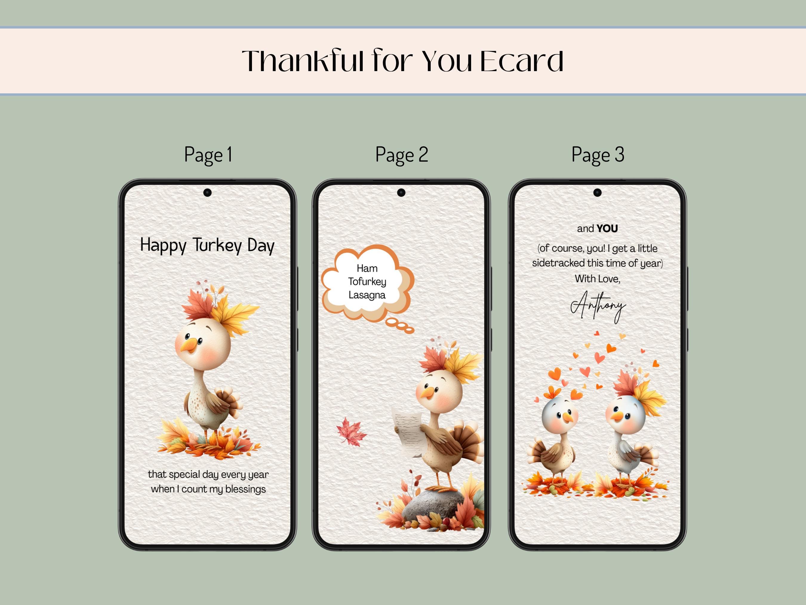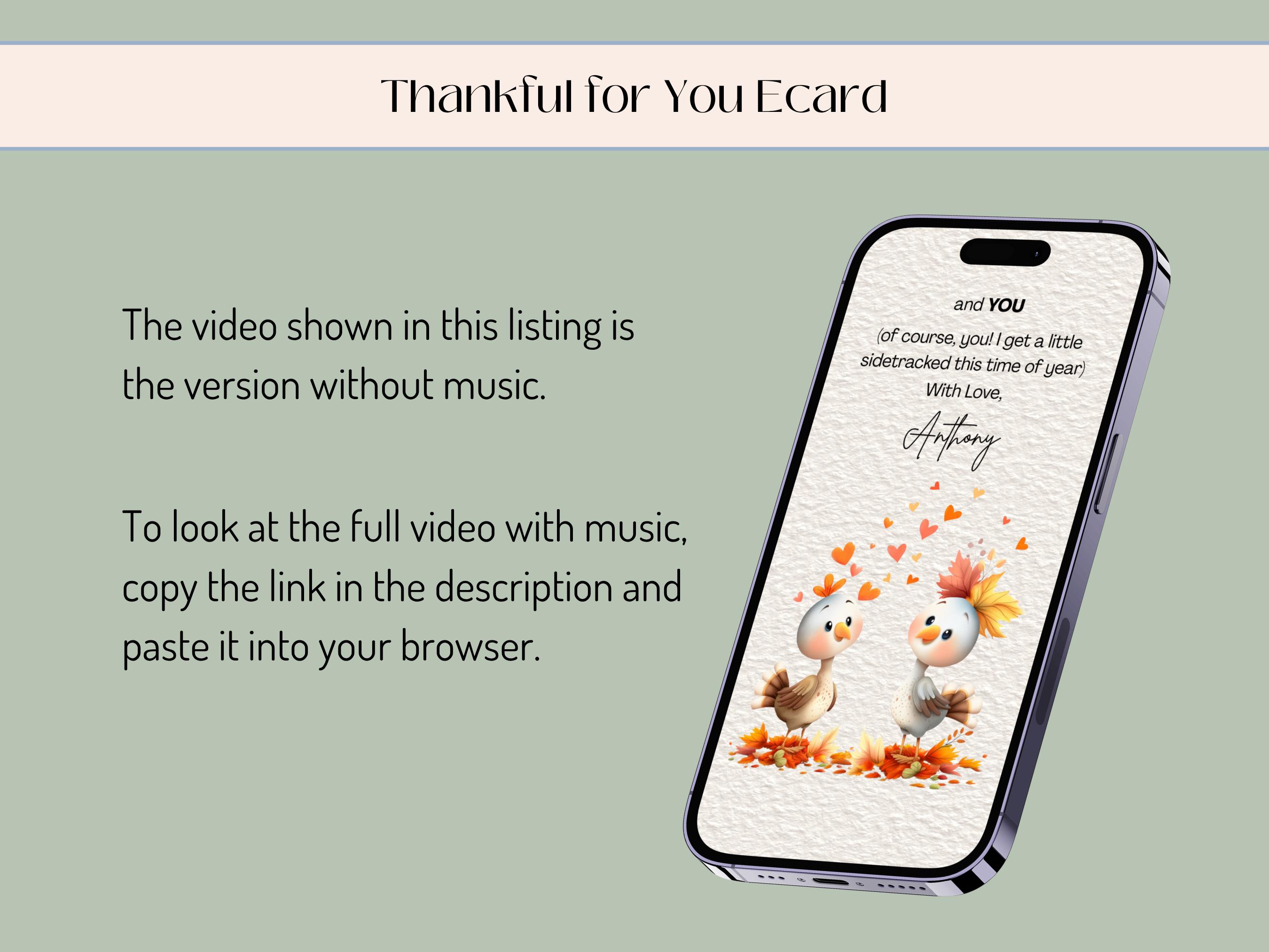 Share a laugh and your gratitude this Thanksgiving with this adorable animated musical video card! Featuring a charming young turkey who gets a little sidetracked counting his blessings - but you're definitely on the list!