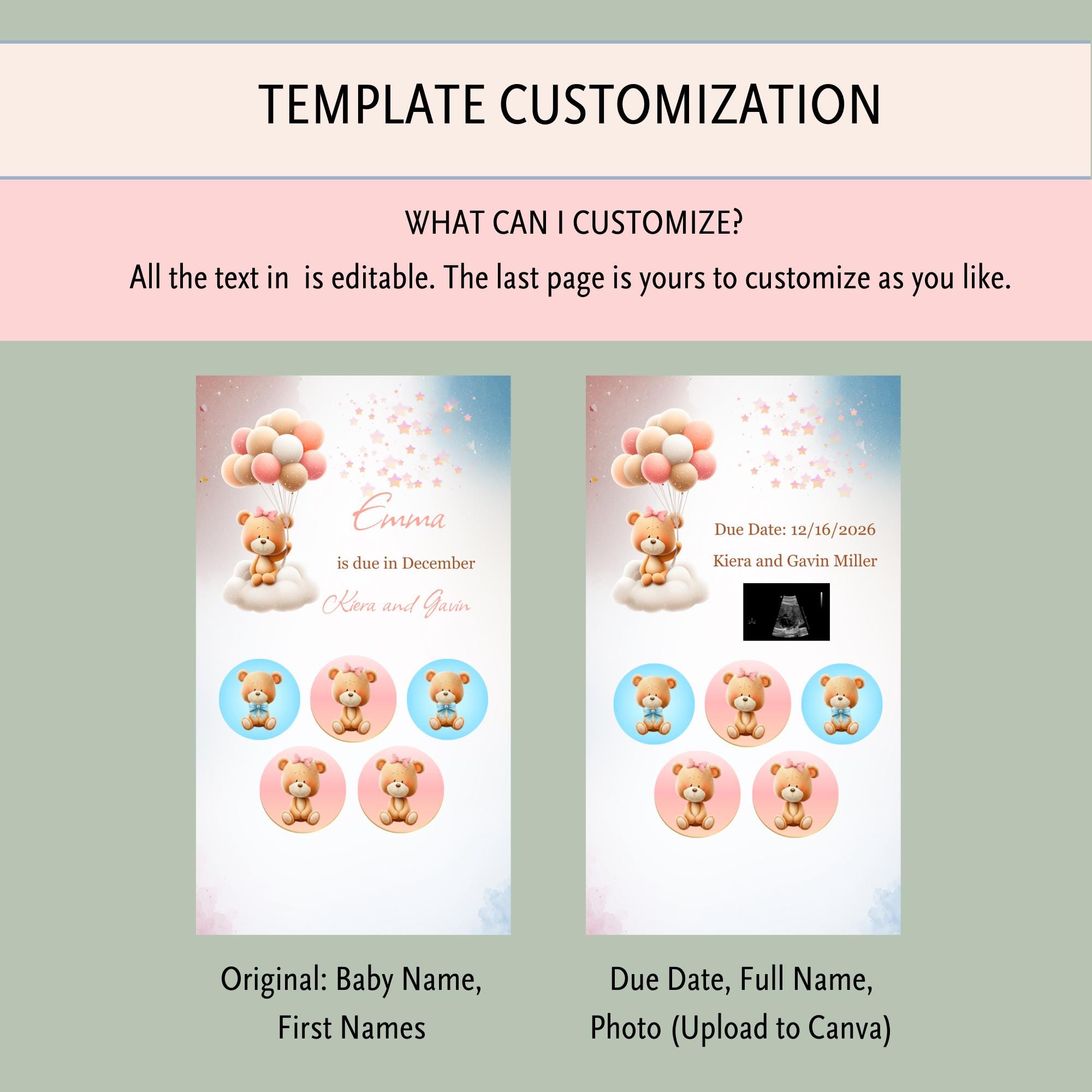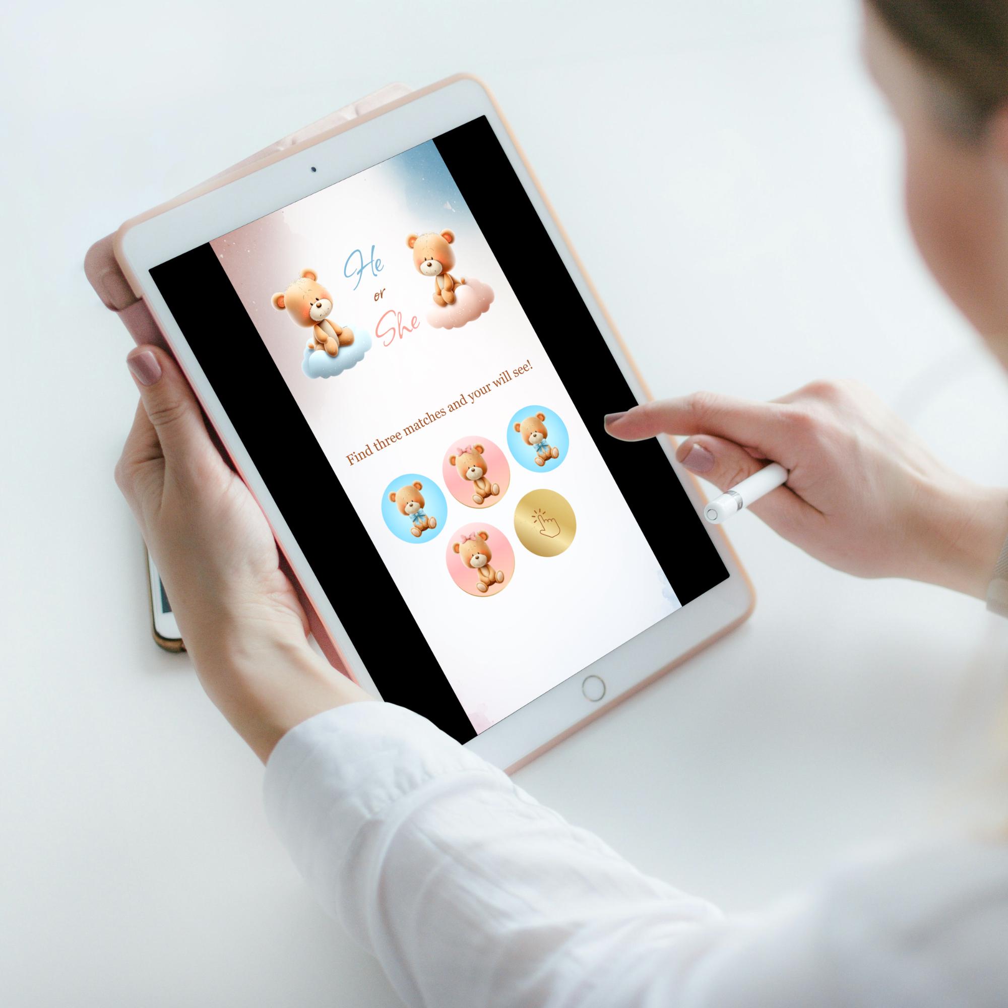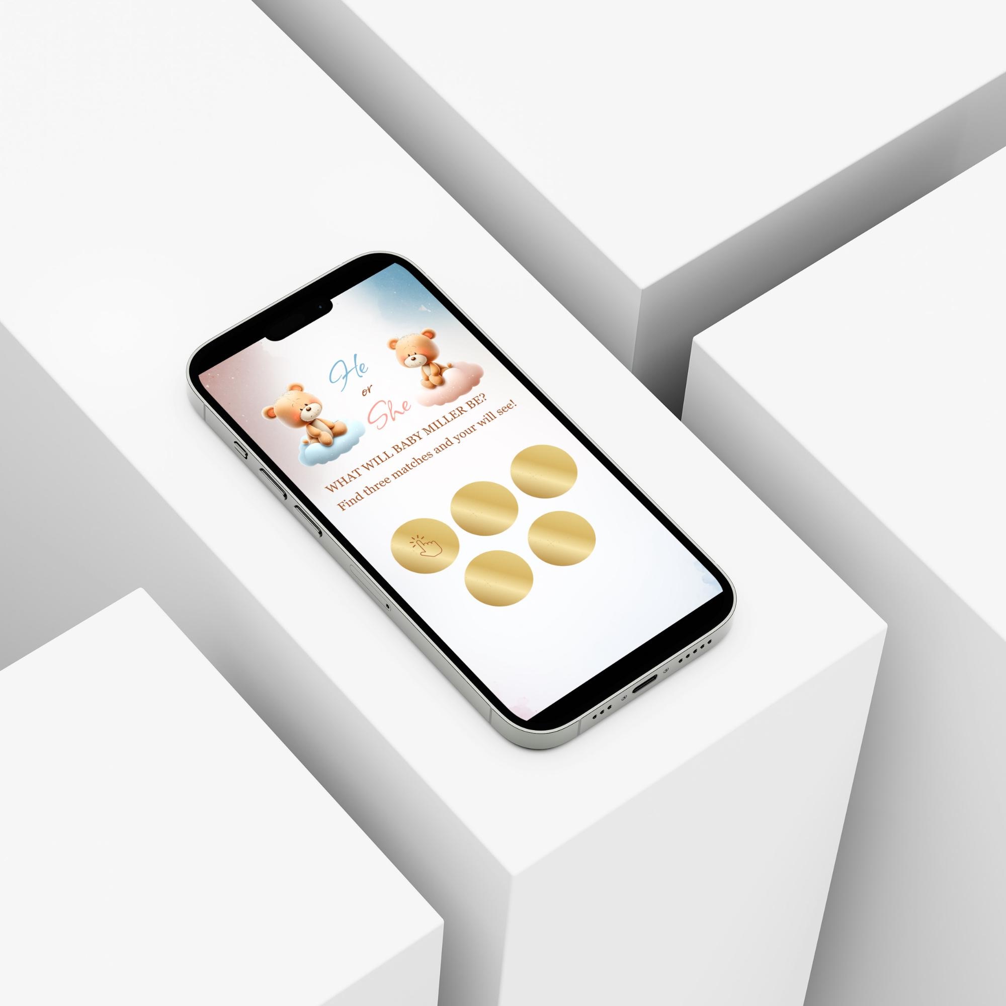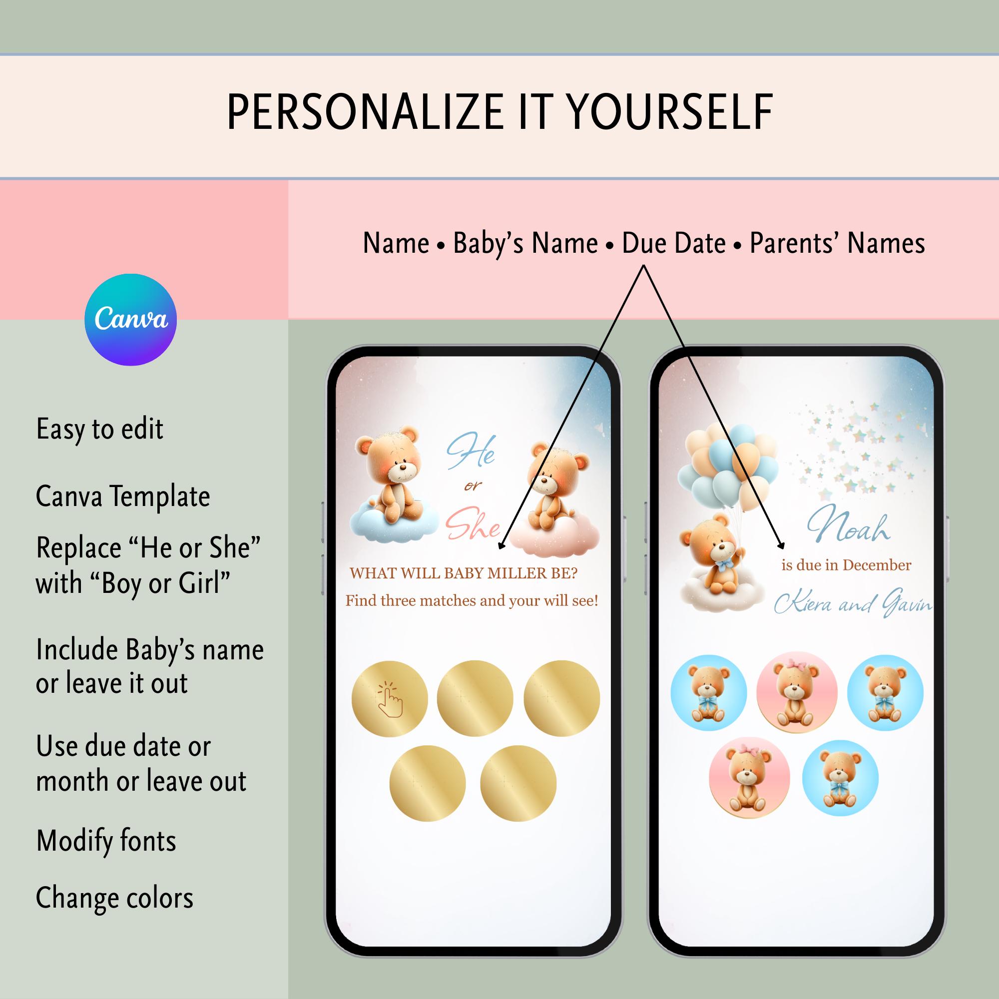 It's a Canva presentation, so as you click the highlighted buttons, the one you clicked becomes an animated scratch off revealing either a girl or boy teddy bear.
