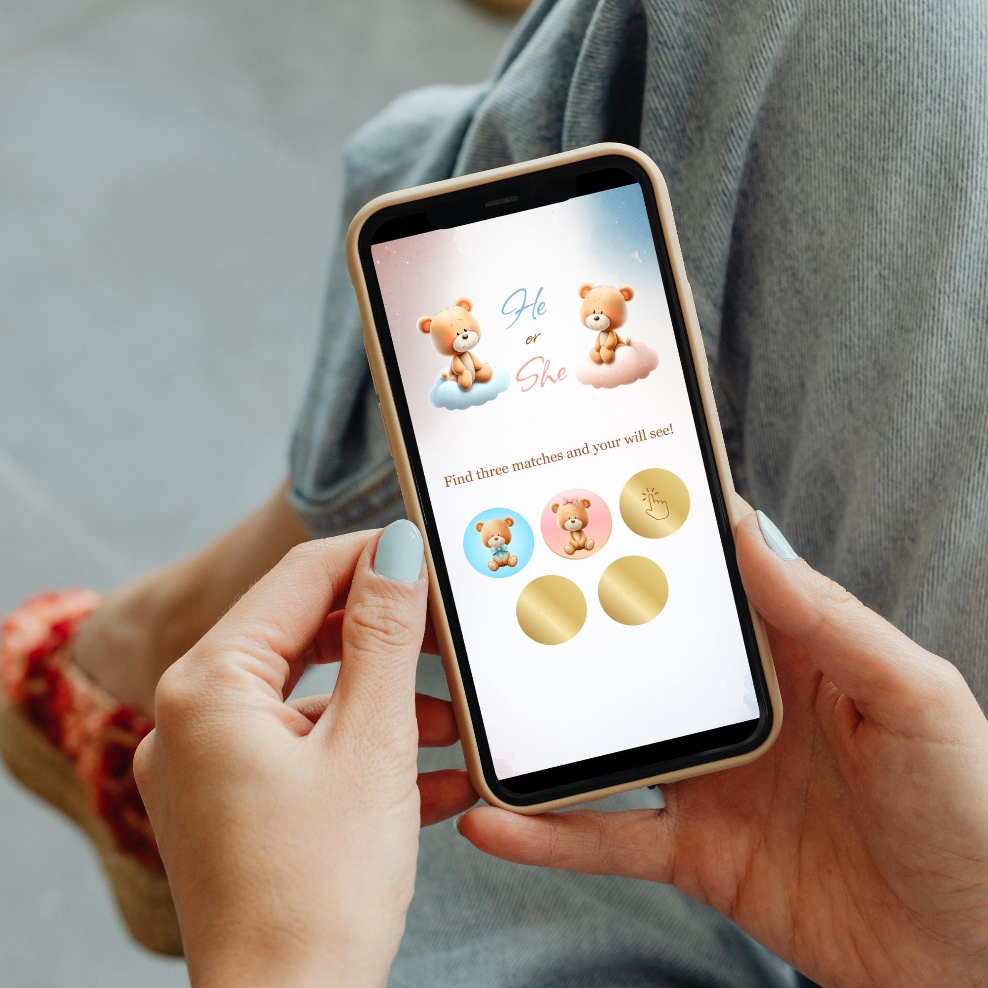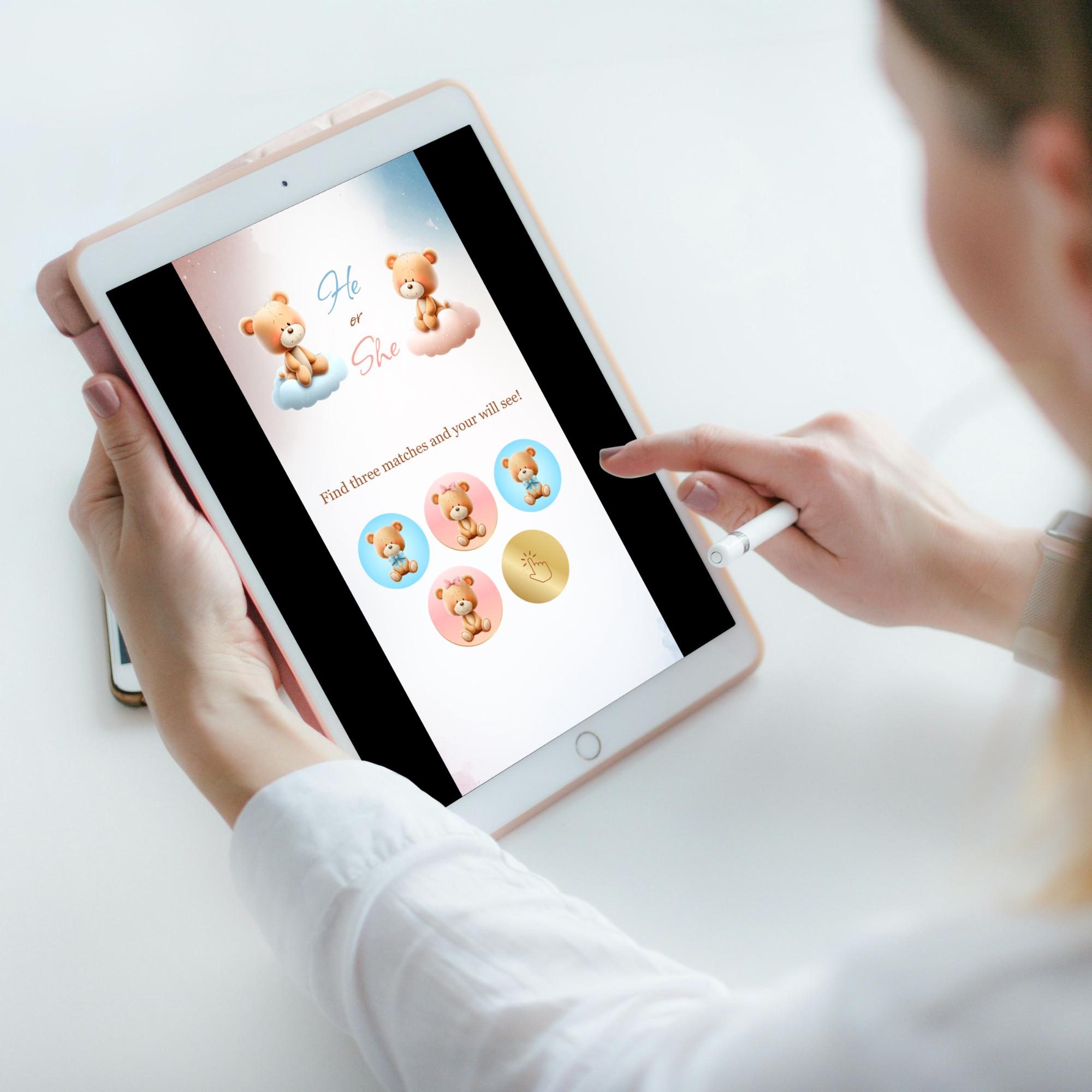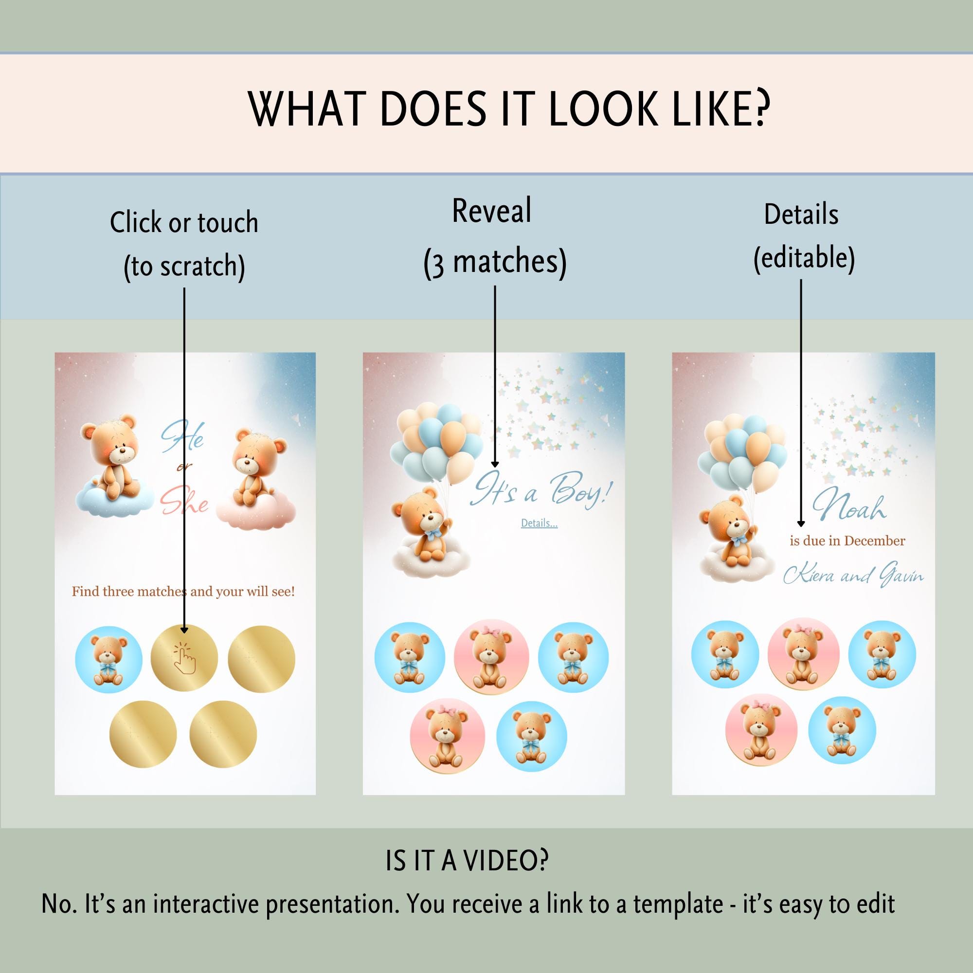 It's a Canva presentation, so as you click the highlighted buttons, the one you clicked becomes an animated scratch off revealing either a girl or boy teddy bear.