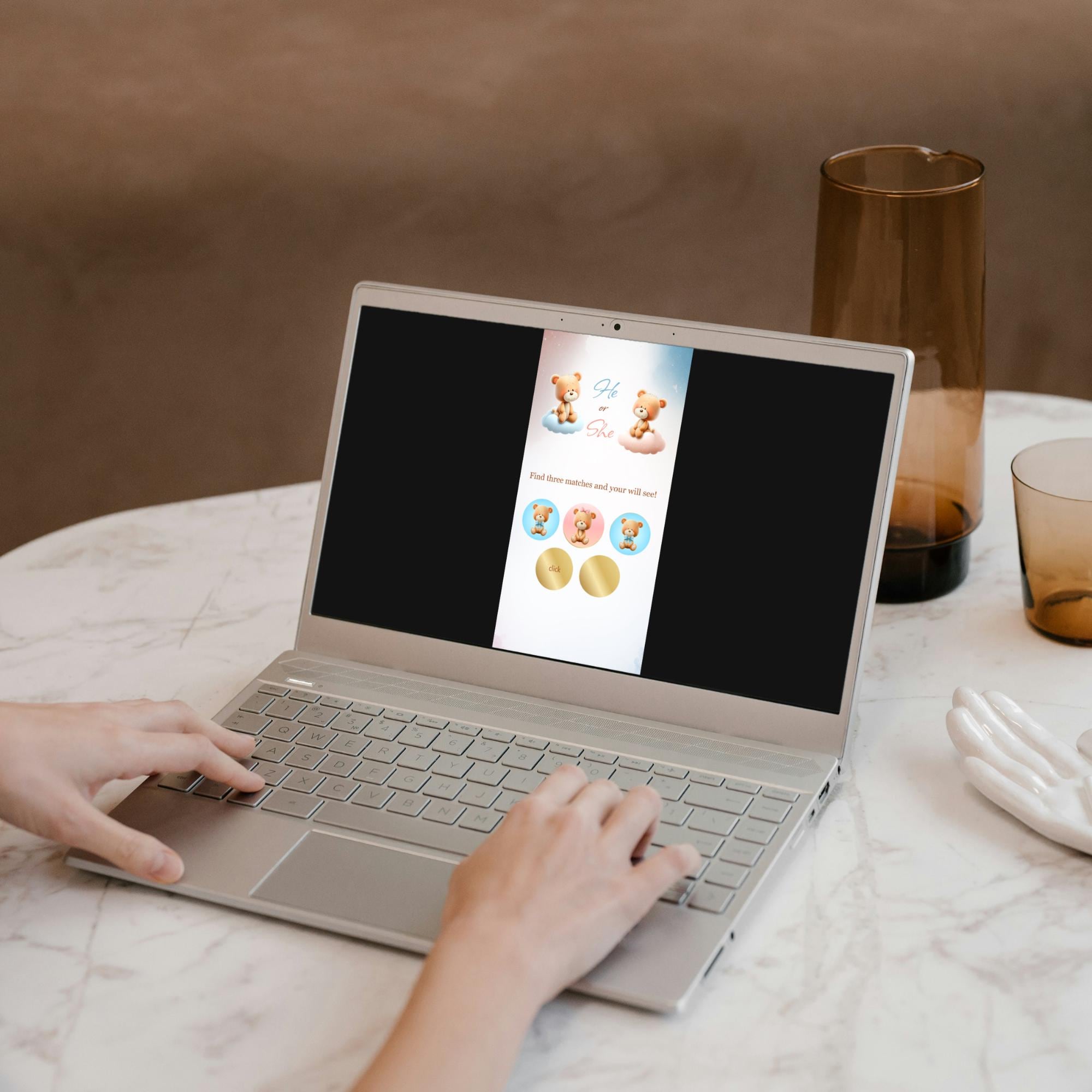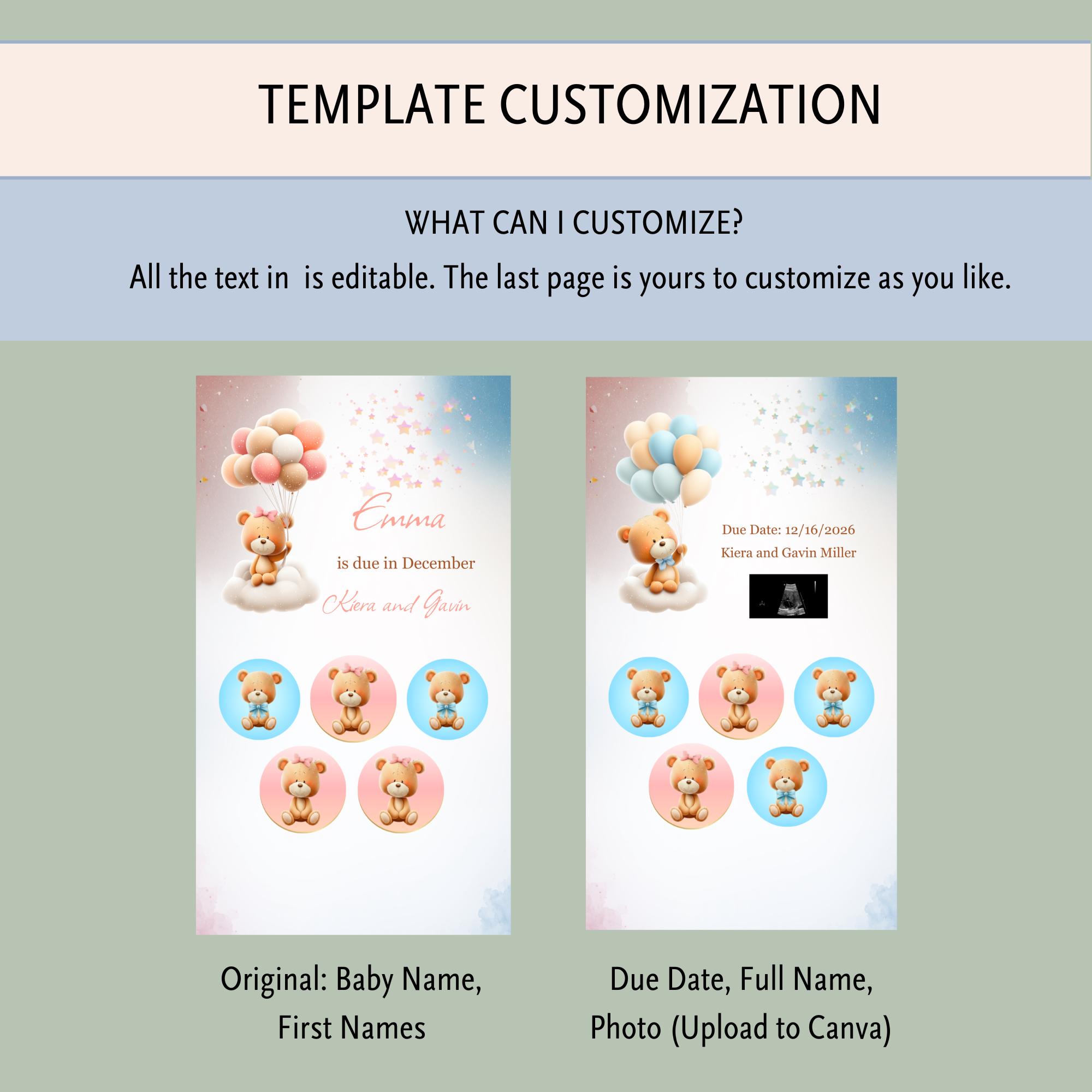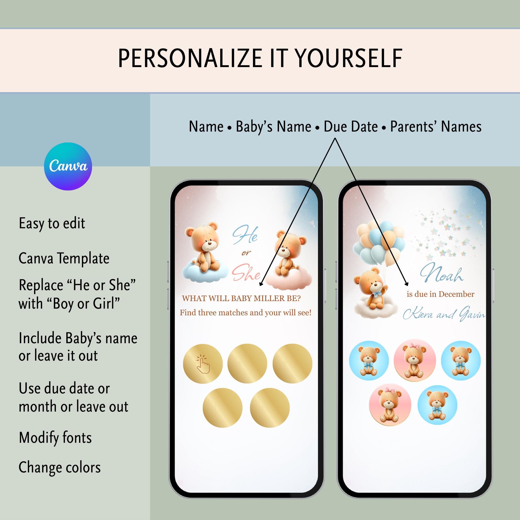 It's a Canva presentation, so as you click the highlighted buttons, the one you clicked becomes an animated scratch off revealing either a girl or boy teddy bear.
